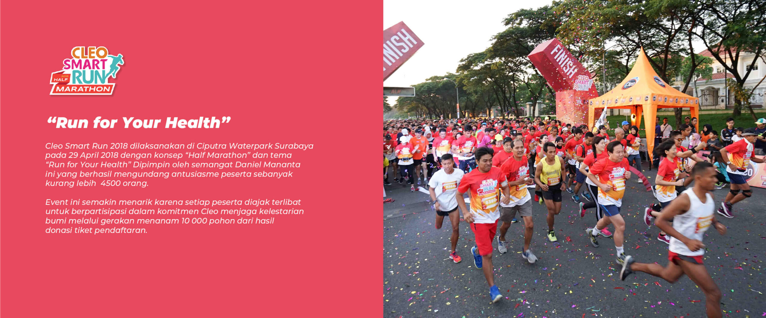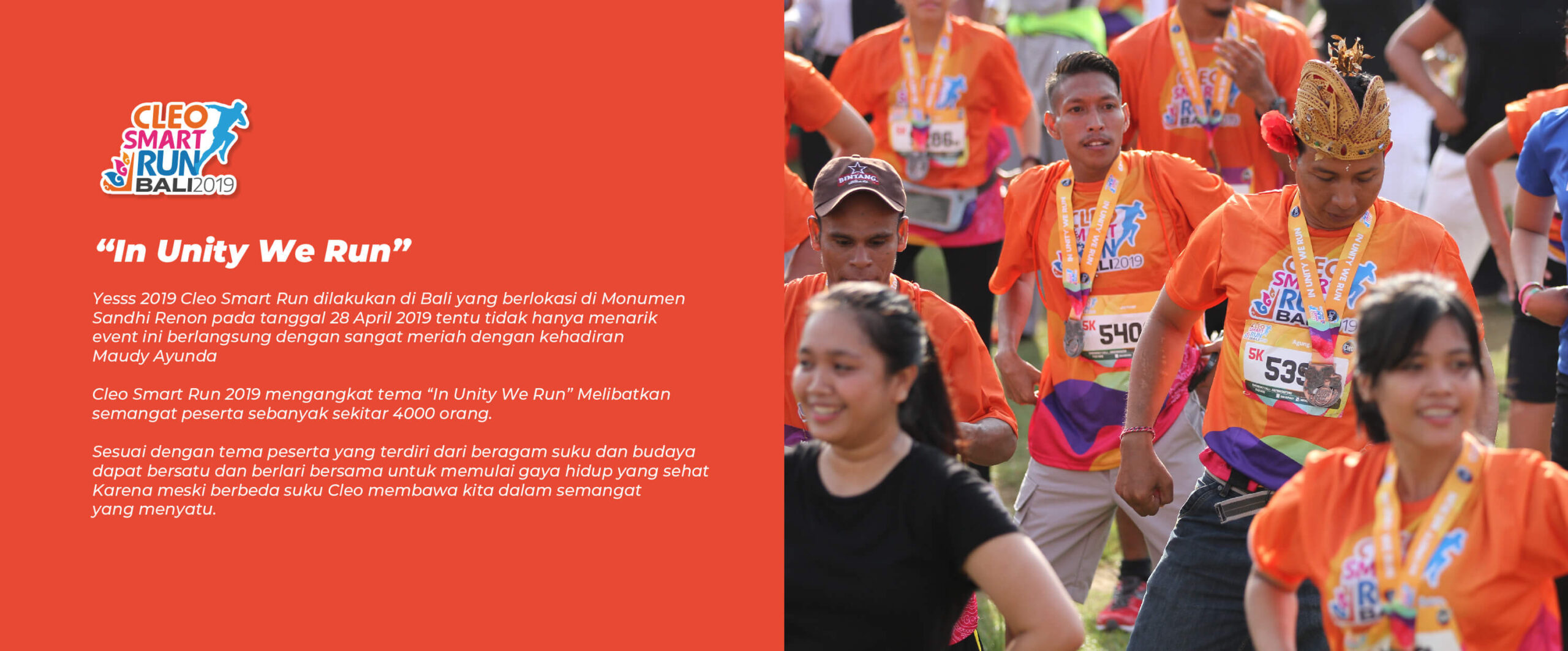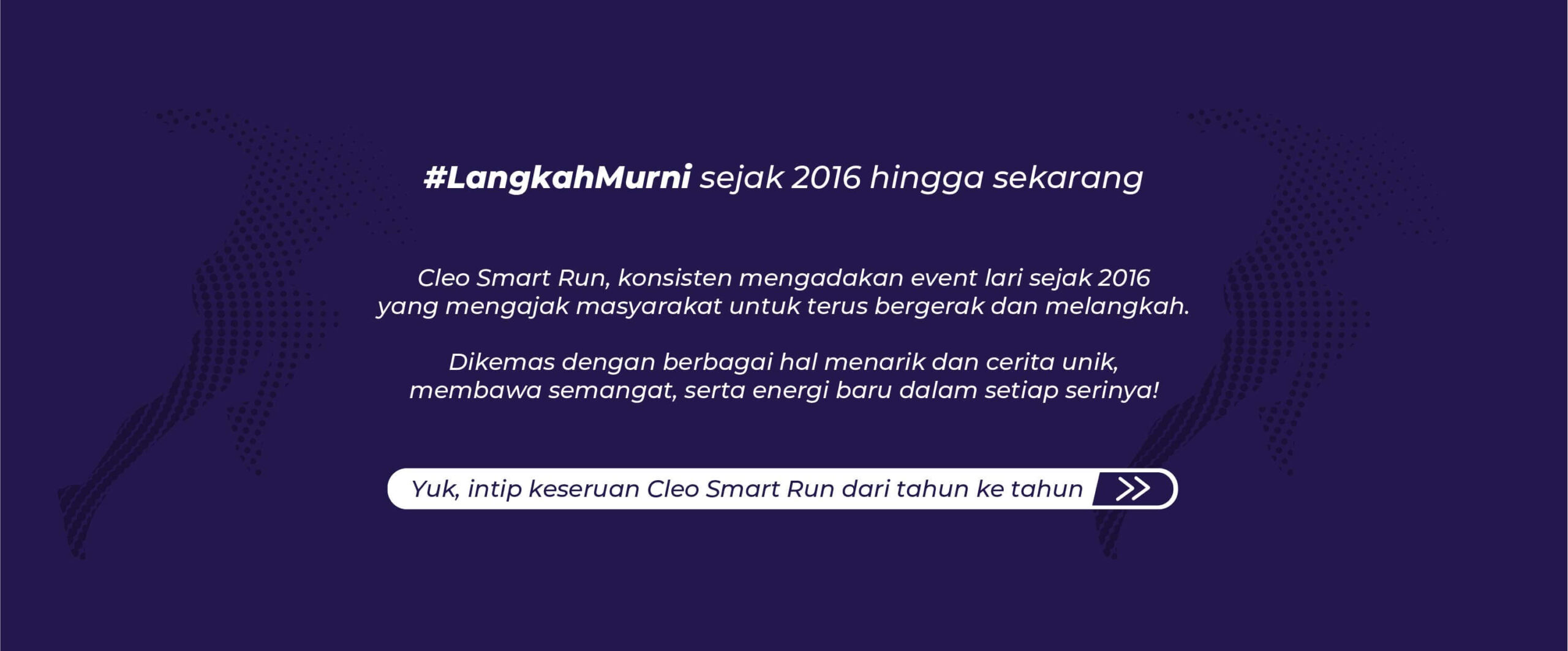 Cleo Smart Run hadir kembali di tahun 2025! Setelah berlangsung di kota Surabaya, Jogja, Bali, Makassar dan Malang, tahun ini Cleo Smart Run kembali hadir dan menyapa Sahabat Sehat kembali di kota Surabaya!. Raih kemenanganmu dengan medali yang melengkapi seri-seri sebelumnya. Dimulai dari #LangkahMurni, bergerak sekarang. melangkah hari ini.
