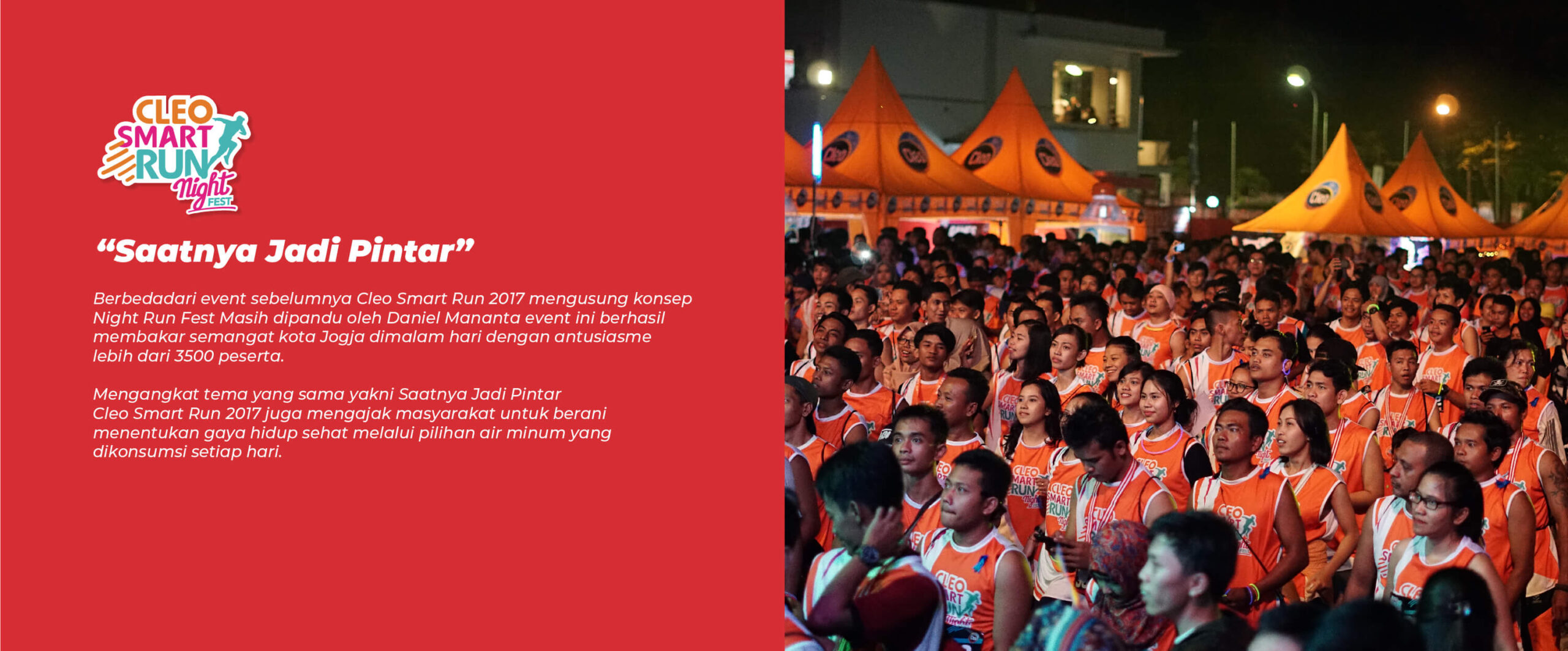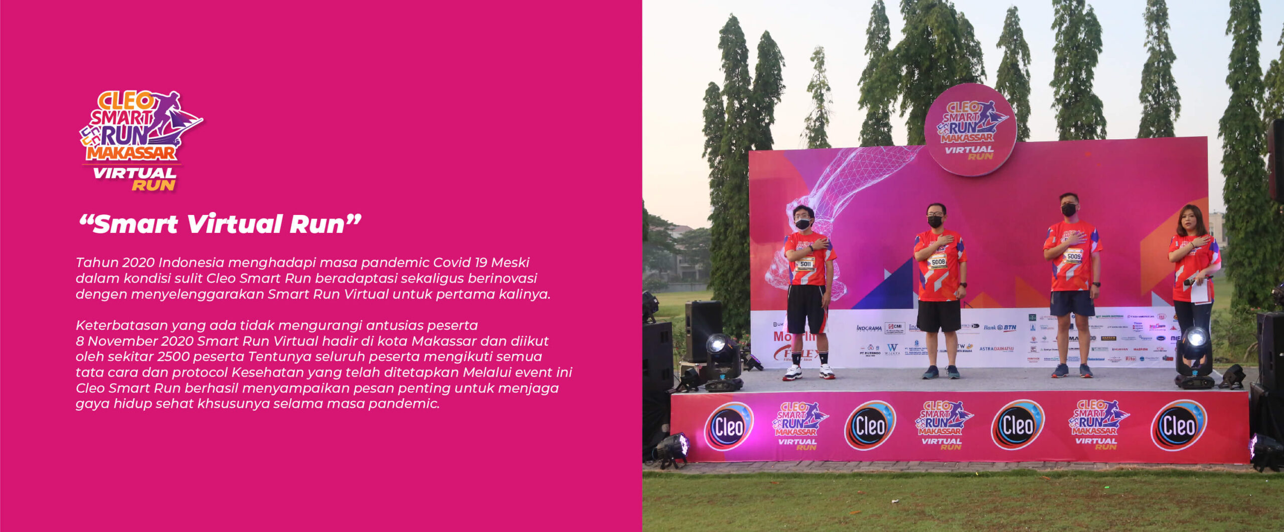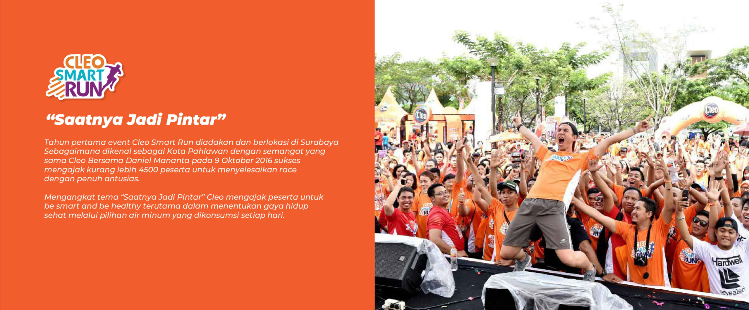 Cleo Smart Run hadir kembali di tahun 2025! Setelah berlangsung di kota Surabaya, Jogja, Bali, Makassar dan Malang, tahun ini Cleo Smart Run kembali hadir dan menyapa Sahabat Sehat kembali di kota Surabaya!. Raih kemenanganmu dengan medali yang melengkapi seri-seri sebelumnya. Dimulai dari #LangkahMurni, bergerak sekarang. melangkah hari ini.